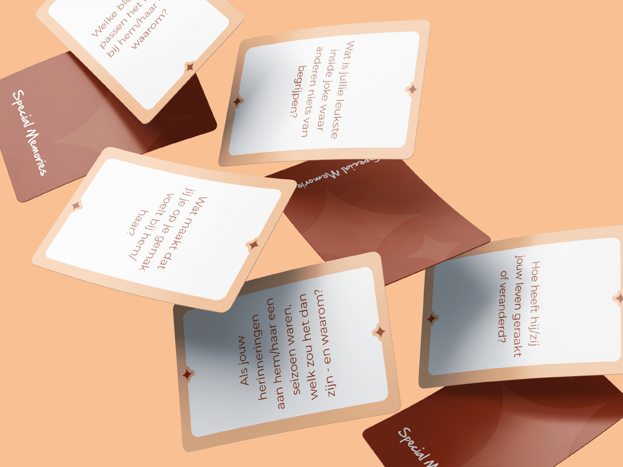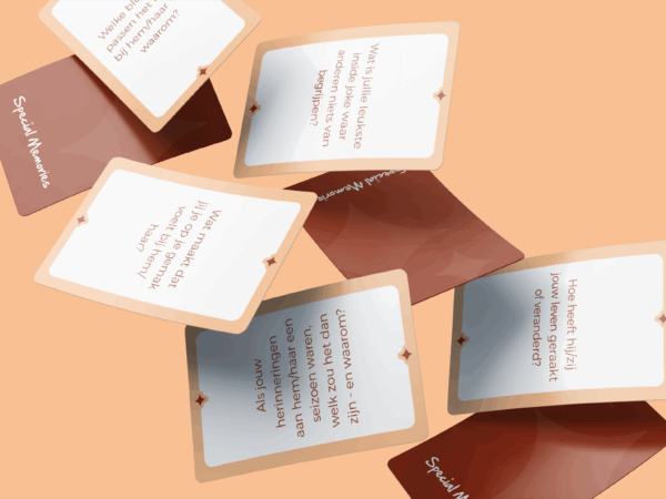 - Waardevolle vragen: Deze Special Cards bevatten 40 zorgvuldig samengestelde vragen die dierbaren uitnodigen om herinneringen op te halen, gevoelens te delen en mooie momenten te vieren. Je hoeft niet elke vraag te gebruiken, kies die vragen die bij jullie passen en laat het gesprek natuurlijk verlopen.